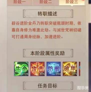 阶段三是玩家击败灭世梵衲,脱胎换骨到达金丹境界,这时转职突破的瓶颈期,需要玩家依靠自身修为难度此劫,玩家要与灭世梵衲切磋就可以打通周身经脉,加速进阶了,玩家去凌霄城找转职仙子,仙子会为玩家进行提示,最后提交任务,玩家转职就成功了。