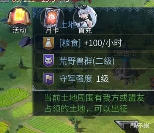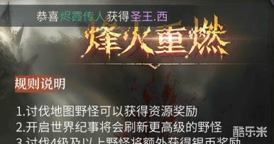 当玩家的主城升到五级之后,就可以参与烽火重燃玩法,该玩法会在野外随机刷新怪物格位,攻打方法和资源田相同。怪物的等级为1~4级,高等级怪物的实力会成倍增长,开启世界纪事将会刷新更高级的怪物。