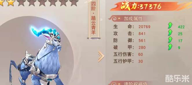 玩家在坐骑的选项中进入,就可以看见玩家拥有的坐骑了,左面介绍玩家坐骑的图片和名称品级,小编的坐骑是四阶踏云青羊,四阶是小编获取坐骑进阶丹一点一点升级而来的,右面介绍了坐骑的加成属性,想要坐骑进阶就需要坐骑进阶丹,大多数情况下坐骑进阶丹是从商城,竞技场,挂机,跨服一对一中获取而来的。