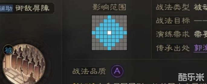 御敌屏障属于被动型辅助技能,效果不需要手动释放,只要自身在场上存活就一直生效。提供周围4格范围内所有友军群体免伤属性。免伤针对各种伤害,无论是武力还是谋略全都可以生效。当技能达到满级时,免伤几率为7%。看似不高,但是生效范围非常大,如果走位得当甚至可以覆盖场上绝大多数己方武将,这对于一个紫色战法来说已经非常出色。