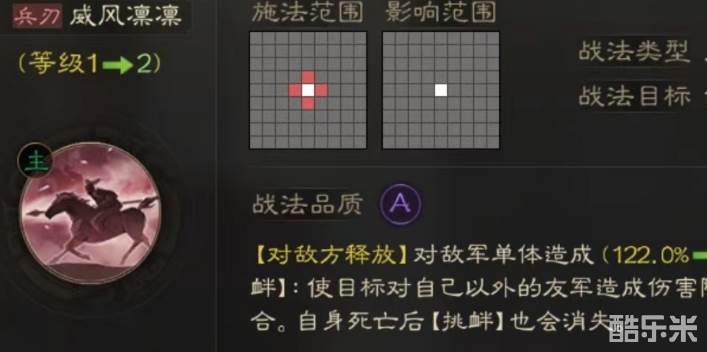 这项战法来自于紫色武将纪灵,相信玩家对这个名字不会陌生,在三国演义前期也是一员虎将,虽然被归到紫色的类型,但是是开荒时,很多玩家经常用的角色。当不需要纪灵发挥作用之后就可以将其分解掉得到威风凛凛。战法效果是选中敌方单体之后造成兵刃伤害,并且附加挑衅效果。挑衅作用是如果目标攻击除施法者之外其他目标,则造成伤害降低,最多持续一回合。