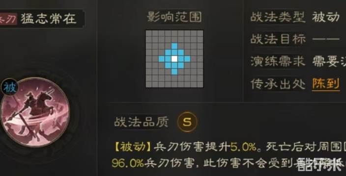 该战法效果是被动类型可以提高携带者兵刃伤害,当武将死亡之后,会对周围两格以内所有敌方目标造成一次群体伤害,无论当前兵力多少,造成的伤害数值都是固定的。当达到满级时,伤害提升效果为10%,最终阵亡时伤害比例为192%,无论从哪方面来看,这都是一个适合冲锋陷阵武将选择的技能,毕竟要想完美发挥出效果,需要在合适时候阵亡。
