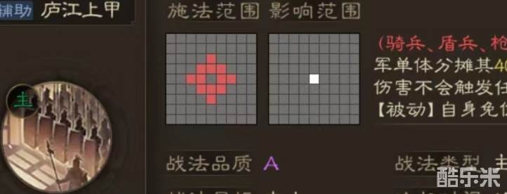 这是一款a级品质的战法,属于主动释放类型,在使用之后进入到一回合冷却时间,而且只有骑兵,枪兵和盾兵,武将才能使用。要想获得需要先得到武将陈武,然后在传承功能中分解掉就能获取。效果是使用之后选定友军目标释放,可以为其分摊受到的伤害,分摊过程持续4个回合。