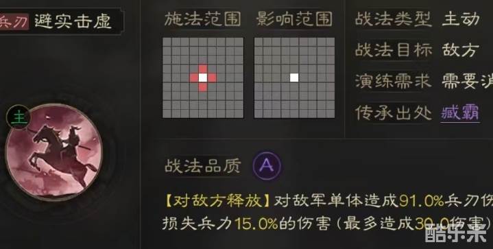 效果非常出色,属于单体攻击类型,伤害分为两个部分组成,第一部分是按照基础比率计算,第二部分是额外对目标已经损失兵力进行计算,按照百分比造成额外损伤,当达到满级时最多能造成3000点。敌方兵力损失越多自然伤害也就越高,这在前期非常有助于快速结束战斗,尤其是开荒阶段直接能节省大量兵力损耗。除了藏霸本身之外,还可以给纪灵搭配上,纪灵属于紫色武将中输出很高的一名。自带战法威风凛凛本身就是单体输出神技,还能附加挑衅状态,现在有了避实击虚更是收割好帮手。