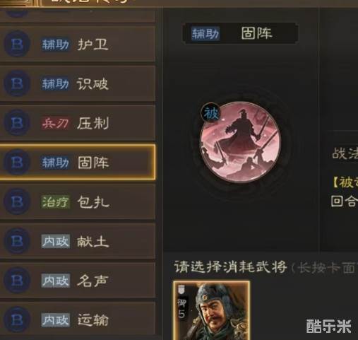 小编认为目前比较适合选择的b级战法有以下几个,第一固阵,是很多防御系武将都能使用的辅助类技能,不需要冷却时间,每次受到兵刃伤害之后,自身统率值都能获得一次提升,最多叠加两次,每次触发之后持续两个回合。当技能达到满级时叠加两次之后,统率提升为42点,在前期已经是很可观的加成。