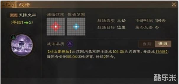 对范围内敌军群体造成56%-112%兵刃伤害,并造成【灼烧】:每回合受到谋略伤害28%-56%,持续2回合。