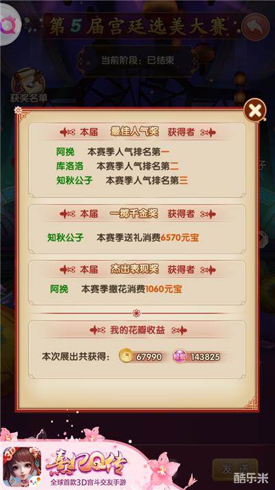 当然,不论是海选赛或最后的决赛,令人艳羡的奖励定然是少不了的。极品装备宝箱、极品图纸礼包、稀有时装材料、精美鲜花、海量金币……着实教人眼花缭乱。能在百花齐放的选美大赛中脱颖而出,除了本身精致的搭配,积累的人脉必然也是实力的一部分。让我们将掌声送给第5届宫廷选美大赛的三位优胜小主,本期《熹妃Q传》选美现场播报到此结束!
