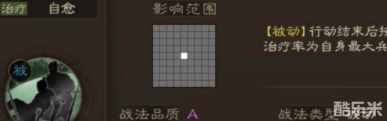 这是一个a品质被动战法,只要能获得紫色武将董袭并将其分解之后,就能直接获得。效果是在回合行动结束后,按照当前自身兵力百分比恢复,达到满级时恢复比例为11%,也就是说如果当前自身最大兵力为1万,那么每回合后治疗数值就是1100。虽然比不上其他治疗武将加血效果,但是作为自身恢复使用,而且是被动加成,已经非常可观。