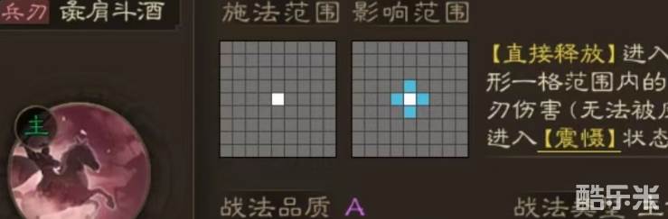 这一技能来自官渡之战中最出名的淳于琼,这名因为醉酒而使袁绍输掉战役的角色,虽然自身实力拉垮,但是所分解出来的技能却极其好用。需要手动释放,中间有两回合冷却时间,使用之后直接进入到醉酒状态,再自身周围一格范围内的圆形区域里所有敌方武将中,随机选择一个对其造成兵刃伤害。输出之后不会受到对方反击影响,接下来让自己和该目标同时处于震慑状态。