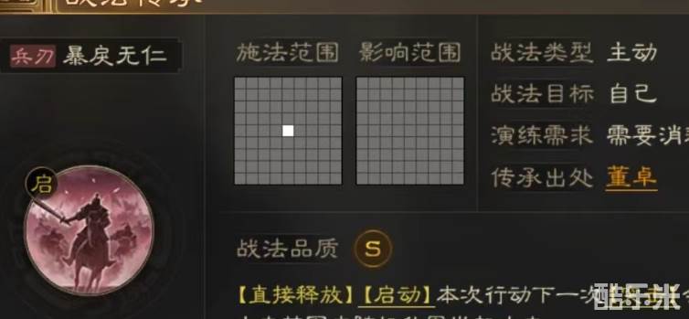 裸衣血战由马超分解后得到,马超本身开荒神将,而且战法被动效果群体伤害很足,但是获得的裸衣血战却是启动类型。使本次行动获得连击状态,连击属于输出中最有效的增益,可以在使用普攻之后连续攻击两次。缺点是在这回合内自身受到伤害提高,造成输出会略有下降。但是和三次攻击相比所下降数值完全可以克服,是很多普攻型角色都适合选择的技能。