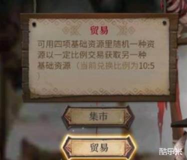2.市场:市场中的贸易界面可以做资源置换,左边是花费的资源,右边是换取到的资源,每天的兑换比例不一样。不要看是以多换少觉得不划算,其实用冗余资源去换稀缺资源一点都不亏,尤其是不征兵的时候,粮食会大量囤积,可以适当用粮食去换别的资源,加速领土的建设。