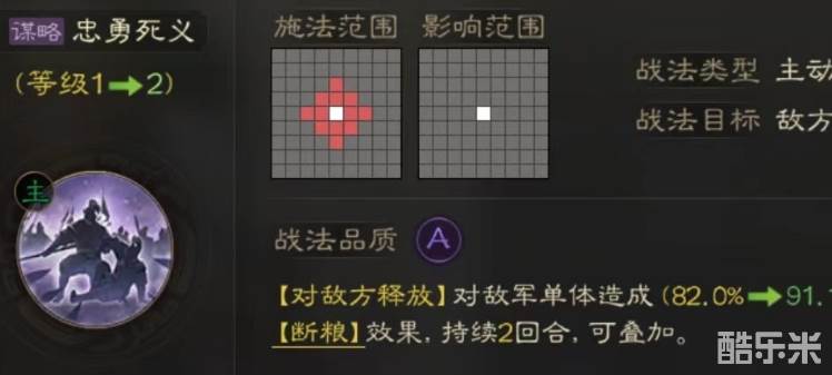 很多玩家对该战法比较陌生,因为它的来源诸葛瞻并不是很出名的角色,仅仅是蜀国阵营中一名紫色武将,而且属性比较差,绝大多数都是作为材料被分解掉。如果以诸葛瞻为主要传承对象,那么就能获得忠勇死义这项战法,人物虽然不突出,但是技能效果却很好。属于主动释放类技能,选中敌方单体后对其造成谋略伤害,并且附加断粮效果。当达到满级时伤害比例也能有164%,施加断粮效果为50%,持续两个回合,可以往上叠加,也可以和其他战法附加的相同效果叠加起来。