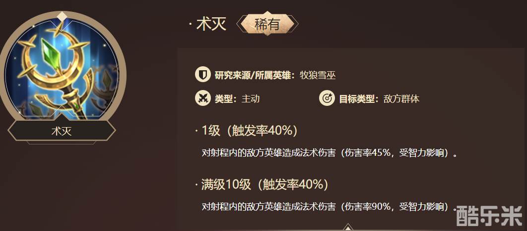 技能效果(10级):(触发率40%)对射程内的敌方英雄造成法术伤害(伤害率90%,受智力影响)。