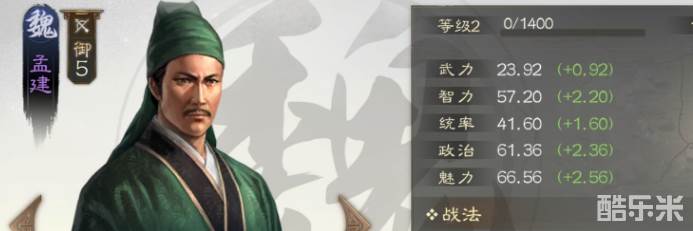 孟建是魏国阵营统率弓兵的武将,智力属性较高,一般这类武将多是在内政中发挥自己的才能,孟建也不例外。智力、政治、魅力三项属性比较高,但与橙卡比就没什么优势了。
