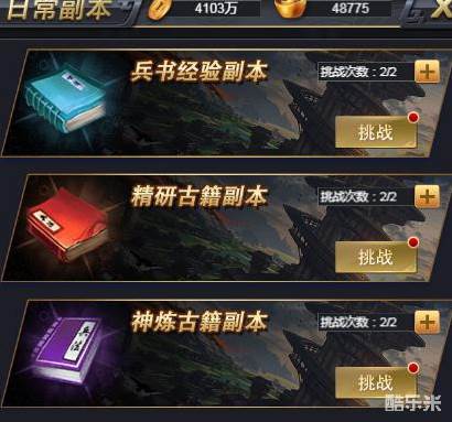 比如说需要兵书升级所需兵法经验书在兵法经验副本中获得。兵书精研所需的精研古籍在精研古籍副本中获得,兵书神炼所需的神炼古籍在神炼古籍副本中获得。