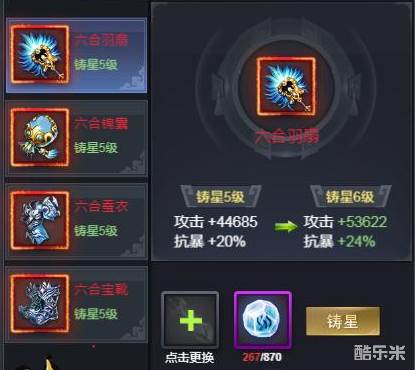 装备铸星:个人觉得这是性价比最高的,铸星需消耗铸星石和同级别装备,但它不仅可以获得并提升闪避,暴击,命中率等属性加成,同时更可提高攻击,物防,生命等基础属性。