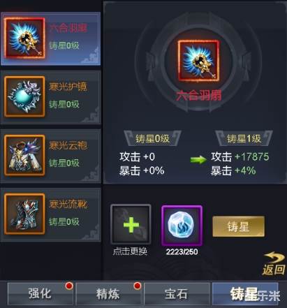 个人觉得这是性价比最高的,铸星需消耗铸星石和同级别装备,但它不仅可以获得并提升闪避,暴击,命中率等属性加成,同时更可提高攻击,物防,生命等基础属性。