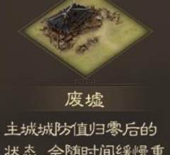 首先要说的便是各位关注到的废墟了,它指的是一座主城的城防数值变为零以后这个地方的实际状态,它会随着时间的推移一点点重建出来,不过这个状态下的区域是可以被他人所占领的。