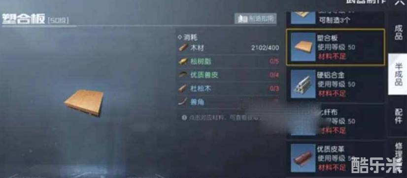 3、松树脂和杜松木可以用于合成制作【塑合板】【硬铝合金】等半成品材料,是用于制作50级装备的必须资源。