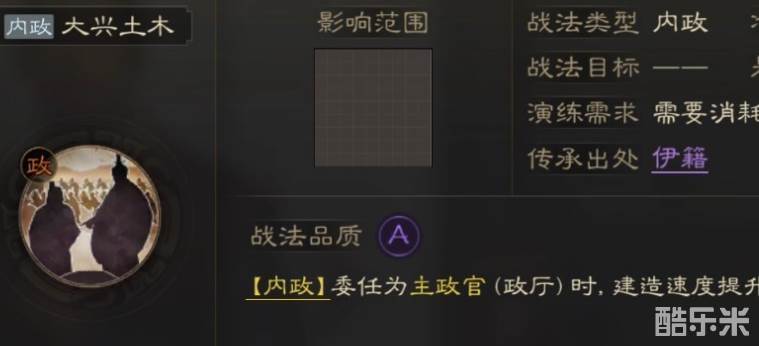 如果你在抽卡、或者内政寻访的时候有获得这个武将,可以保留。这个技能的效果是提升最大2.5%的建造速度,当然前提是被任命为主政官。将其作为传承战法给到那些专攻内政的谋士就挺不错,例如裴秀,他自带的战法能加快攻城器械的建造时间。