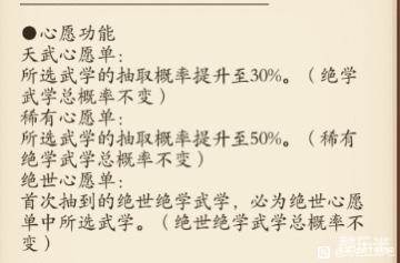 2、300抽没出绝世,可以根据绝世心愿选择自己喜欢的套路,虽然绝世还没出,但是你可以先把系别券用来抽绝世心愿同类的武学(系统送的一些自选武学礼包先不要开,确定好发展路线、等抽不到的时候再开来补充),因为绝世心愿是保证下本绝世必出心愿类的,如图: