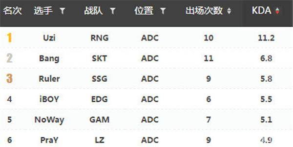 但是明辅助的uzi,他的kda是11.2,同样遥遥领先于第二名的bang。