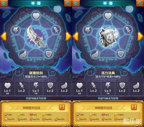 魔王大陆目前出现的神器总共分为四大类,分别是:武器、饰品、圣典、法器!而这四种神器在游戏中分别代表着各位勇者的攻击力、金币获取、圣光守护、英雄之魂!所以一旦各位勇者开启了一个神器后将可以获得相应的属性加成。比如勇者们开启了一件武器类神器,那就可以获得相应的攻击力加成,而如果开启了一件法器类神器,那就可以获得英雄之魂战力加成。