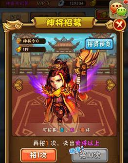 神将招募:可招募蓝、紫、橙将,消耗300元宝或者神将令可招募一次,10次必出紫将以上,2800元宝可进行10+2连抽。