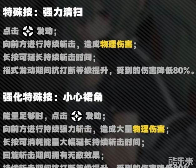 普通攻击是非常简单的五段连击,一定要注意节奏打满伤害,特殊技需要两种发动方式,点击触发向前方连续攻击,长按可以延长斩击时间,一般在普通攻击后直接接上。然后能量积攒够之后,还能将特殊技进化为强化特殊技,使用方式和攻击动作不变,但是在长按时能够以消耗能量方式大幅提高延续时间,回旋斩期间还将拥有无敌效果,在持续斩击期间,自身抗打击能力不断提升,受到伤害降低。在这一期间打断可琳是非常困难的,可以放心输出。
