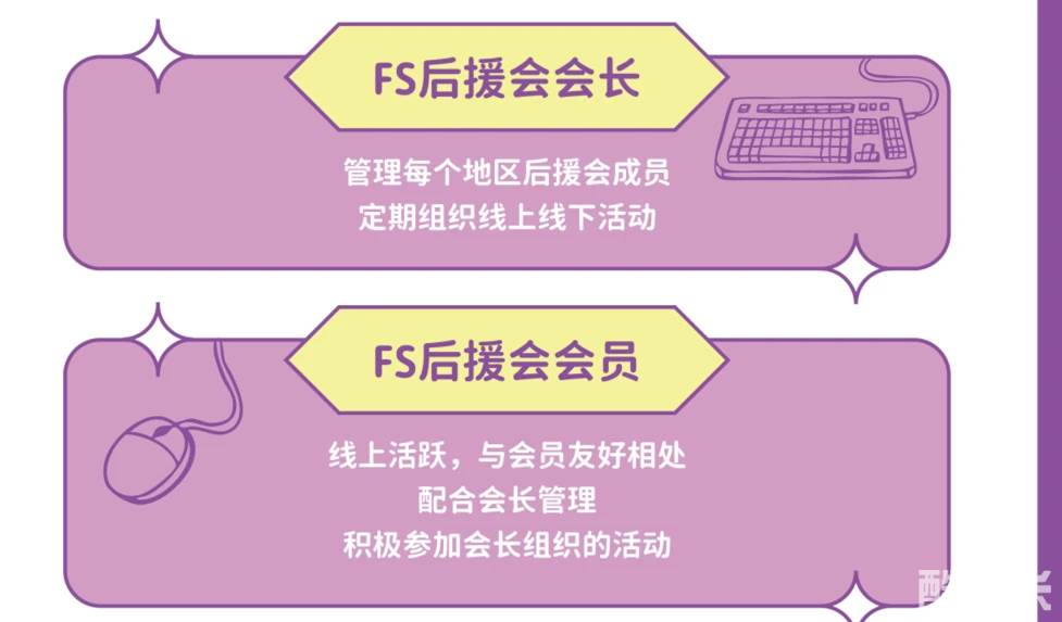 FS后援会会长:负责管理每个地区后援会成员,定期组织线上线下活动
