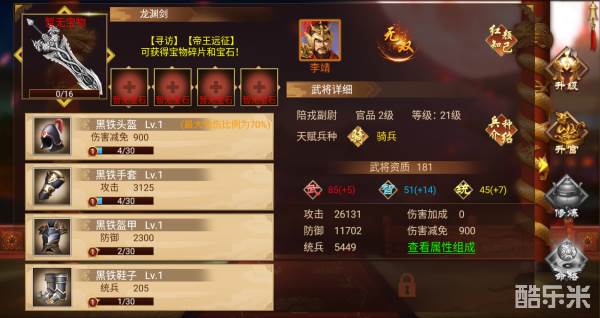 武将还可进行升级、升官、修炼及命格4项养成,均可提高武将属性。