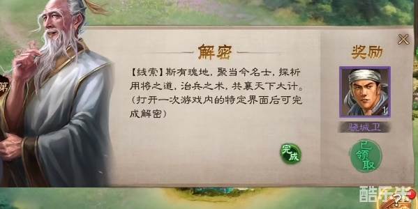 线索:斯有瑰地,聚当今名士.探析用将之道,治兵之术,共襄天下大计。(打开一次游戏内的特定界面后可完成解密)