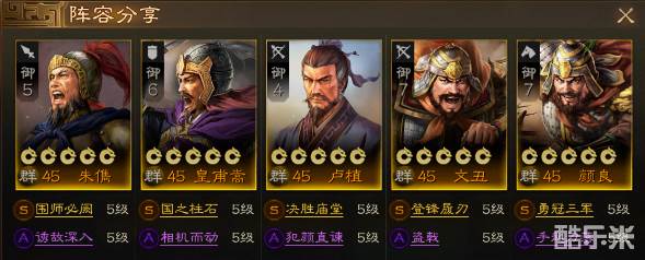 朱儁(5御枪)+皇甫嵩(6御盾)+卢植(4御弓)+颜良(7御骑)+文丑(7御弓)