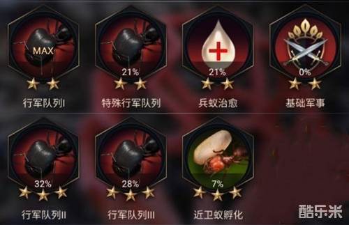 不过值得一提的是,要想培养军事研究,首先大家要将基础内政研究升至80%才行,否则前期会非常难度过。而当达到目标后,优先选择培养行军队列,其中的升级队列Ⅰ和特殊队列是重点。至于兵种强化,则重点研究克制属性强化。另外兵蚁治疗也是重点,大家不要忘记了。