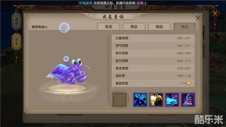 另一种是保护型的珍兽。可以选择体力资质最高的平衡型珍兽。技能的选择,在新版本中比较流行肉墙技能珍兽。可以替主人承担一定的伤害。四个自动技能的选择根据个人需求来定,最好是有迟钝和憨厚两个技能,增加珍兽的防御和血量。其他两个技能就随意了,可以选择摔绊,破绽,强身,借力等等。特别注意的是技能最好全部学到三级,增加的额外属性是非常划算的。