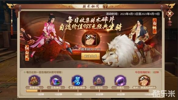 红白凤、白狮经典坐骑,上线参与“骑术秘闻”活动即得:当年为骑上英姿飒爽的60级门派坐骑,众多少侠为购买骑术疯狂攒钱,倍受折磨,对门派坐骑可谓记忆深刻,又爱又恨。在4月13日至4月19日期间,少侠在《天龙八部手游》中登录,参与“骑术秘闻”活动,只需5天,即可在峨嵋、明教经典坐骑【自选不限期经典坐骑-红白凤/永久经典坐骑-白狮】中二选一。而且为了满足各位少侠搜集意愿,天龙八部手游取消坐骑的门派限制,人人皆可拥有。