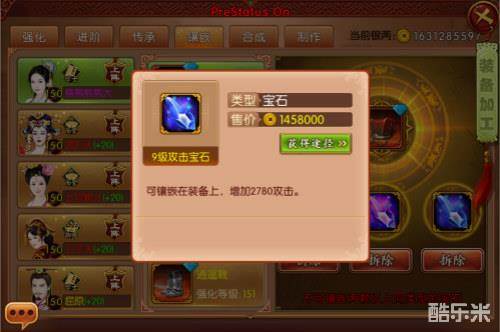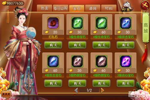 老玩家都知道游戏必备功能即为装备材料的合成升级,《熹妃传》的宝石也不例外,收集的低级宝石可通过合成升级,替换掉等级较低的宝石,提高装备数据!相应的,镶嵌槽有拆除宝石的功能,宝石合成升级后,将新的高阶宝石重新镶嵌,菜鸟一步一步变大神有木有!