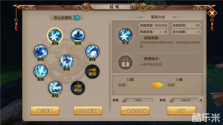 雪出六花:对目标发动如风雪连绵般寒冷澈骨的攻击,可对目标造成大量的伤害。瞬发技能,冷却时间是6秒,算是天山最基础的技能,伤害能力一般。