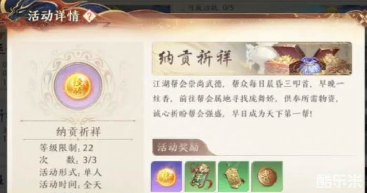 每天可回帮派属地找到庞舞娇参与活动,供奉物资即可获得经验以及奖励。