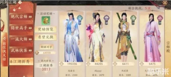 江湖宗师殿通过挑战玩家提升排名可获得绑定元宝奖励以及名望奖励。