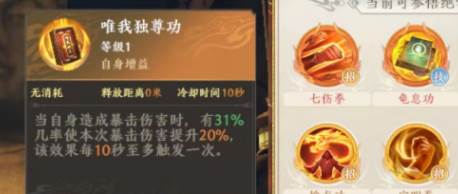 秘技秘籍最好用的当属唯我独尊功、神足经和混天功,唯我独尊攻非常霸气,只要触发暴击就能有几率提高本次暴击伤害。神足经当受到控制时,有较小几率直接免疫本次控制效果,同时提高自身内外功防御,混天功激活之后,但凡普通攻击都有几率对目标造成眩晕效果。可以根据实际情况,从这些秘籍中选择最适合自己的装备上去。