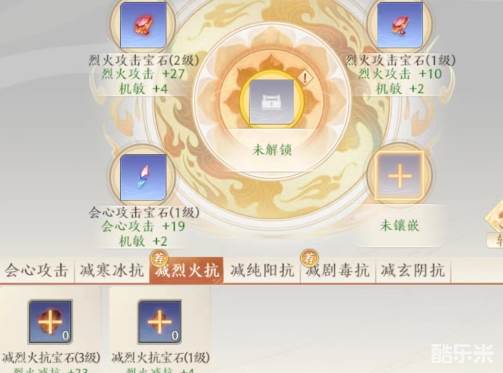 这两种属性宝石除了主属性之外还会附加机敏,机敏本身对于逍遥来说也很关键。接下来的镶嵌孔中,凡是有命中和会心攻击的,优先选择会心攻击。逍遥本身就非常依赖会心攻击造成的伤害爆发,而且会心攻击宝石还会附加机敏属性。接下来还有两种宝石属于降低对方抗性类型,依然是选择减烈火抗和减剧毒抗,这些宝石在镶嵌之后能够降低敌方对应的抗性,相当于间接提高了主属性伤害。但是在收益方面不如直接提高属性更可观。