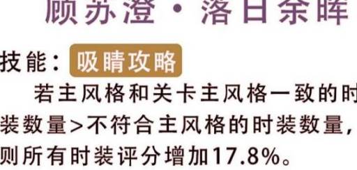 这个卡牌拥有一定的技能效果, 吸睛攻略是它的技能名称,玩家们如果能创作风格和关卡风格一样的时装,数量越多所能为我们提升的加成就越多,最多可以提升17.8%。