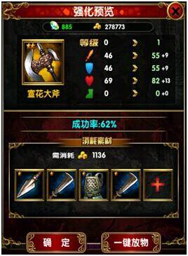 每个星级的圣物都可以用其他的圣物强化,圣物越多强化成功的几率越高,每次最多只能放5个圣物。圣物强化需要消耗一定的金币。