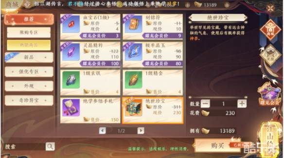 商城-热销商品中出售的绝世珍宝,价格230元宝,使用有概率获得一定数量的金遗碎片,还有概率直接获得神兽遗赠!