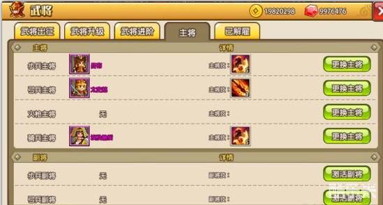 首先为大家介绍一下主将。步兵、弓兵、火枪、骑兵每个阵营可设置一名主将,设置为主将的武将可100%释放主将技。