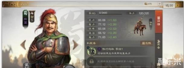 自带的战法叫做性行均淑,这个技能是一个被动的技能,在一场行动结束之后可以在上面为友军恢复一些兵力,不过就是是单体技能,所以在群战中有点差,如果受到智力影响的话,28%的治疗率还会受到影响,有点一般,相比之下传承技能就要好用一些了。