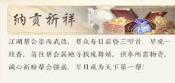 这个每天能够进行六次挑战,从中能够获取到不少经验值,完成方式也很简单,你们只需要使用自动找路的功能,然后去往对应的地点就可以了。另一个与帮派相关的任务是纳贡祈祥,它也是单人模式的。