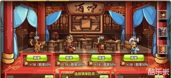 在酒馆内消耗老窖或二锅头与武将进行猜拳,猜拳胜利后可招募该武将。酒馆内共有3种猜拳方式,3种方式获胜的概率不同,消耗的老窖或二锅头的数目也不同。酒馆内会有几率出现神将并且把他带回家,是不是听起来就非常激动呢~