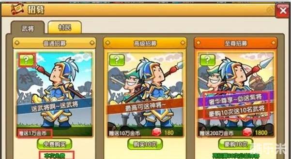 村长大人们可以在村庄界面下部点击【招募】→【武将】进入武将招募界面。每次招募都会额外赠送金币。